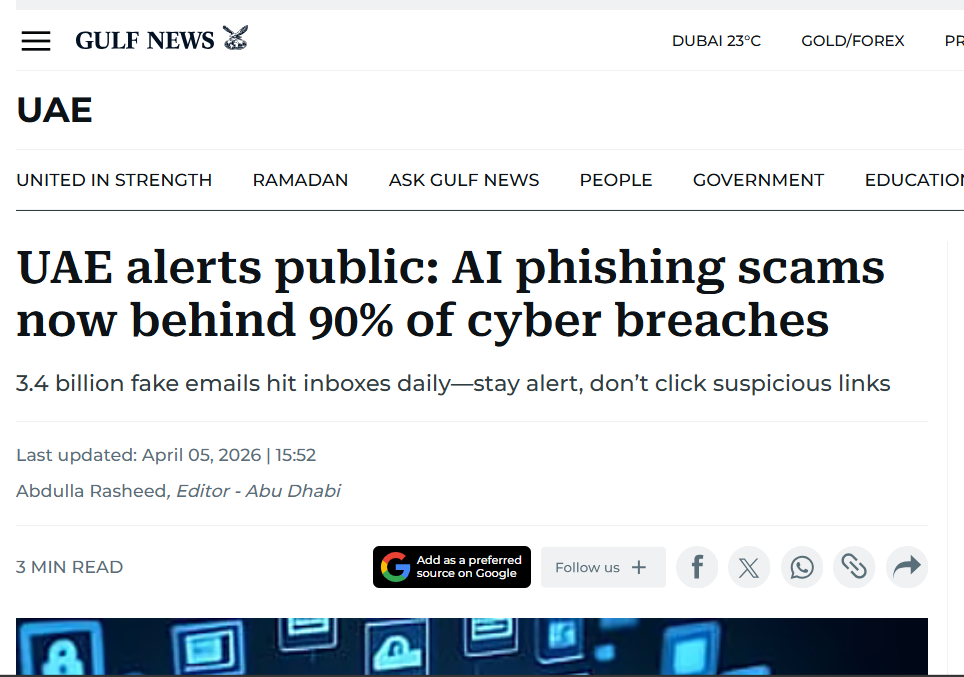 网络钓鱼作为最古老且持续有效的网络攻击手段,长期占据数据泄露源头的主导地位。生成式 AI 的普及彻底颠覆其技术形态与攻击效率,使传统依赖语法错误、特征库匹配的防护手段近乎失效。2026 年 4 月 5 日,阿联酋官方媒体 Gulf News 援引阿联酋网络安全委员会通报,明确AI 钓鱼已造成 90% 以上的数据泄露,日均欺诈邮件量达 34 亿封,覆盖政府部门、金融机构、能源企业与普通民众,区域数字安全面临严峻挑战。该预警并非孤立事件,而是全球网络犯罪智能化转型的典型缩影:攻击门槛大幅降低、内容逼真度指数级提升、传播链路全自动化、逃逸能力持续增强,形成 “低投入、高回报、强隐蔽、快扩散” 的恶性生态。