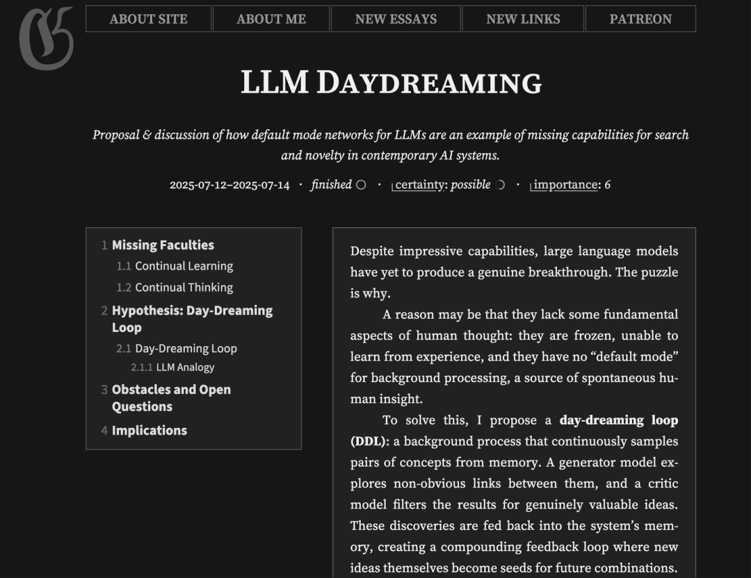 一篇来自知名独立研究者 Gwern Branwen 的长文《LLM Daydreaming》,对此提出了一个极具启发性的假说。