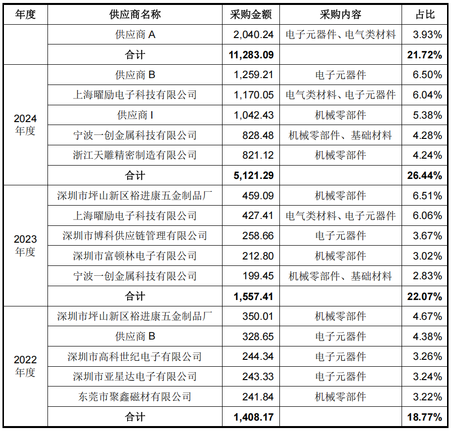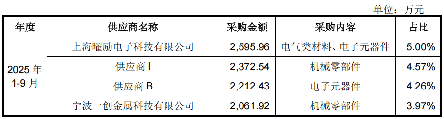 从披露的前五大供应商来看,报告期内,上海曜励电子科技有限公司、宁波一创金属科技有限公司、供应商B和供应商I 是宇树科技的主要供应商。