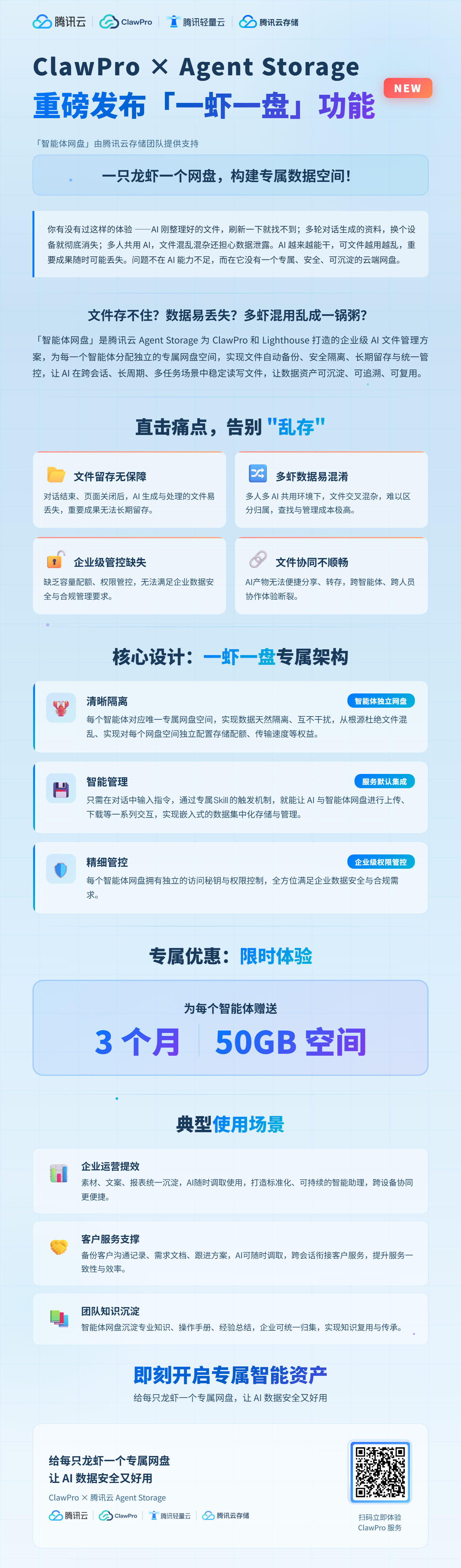 ClawPro × 腾讯云存储 Agent Storage 重磅发布「一虾一盘」功能,为企业级 AI 文件管理提供专属解决方案。该功能为每个智能体分配独立的专属网盘空间,实现数据清晰隔离、长期留存与统一管控,有效解决 AI 使用中文件易丢失、多智能体数据混杂、缺乏企业级安全管控等痛点。通过集成智能体网盘,用户可在对话中便捷上传、下载文件,支持跨会话、跨设备调取数据,保障重要成果可沉淀、可追溯。典型应用于企业运营、客户服务与团队知识沉淀等场景,现为每个智能体赠送3个月 50GB 空间,助力构建安全、高效的专属数据资产。