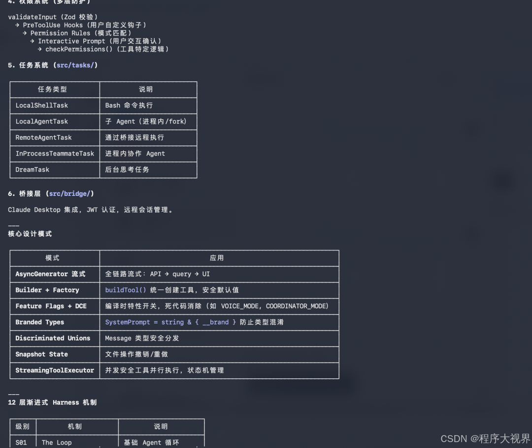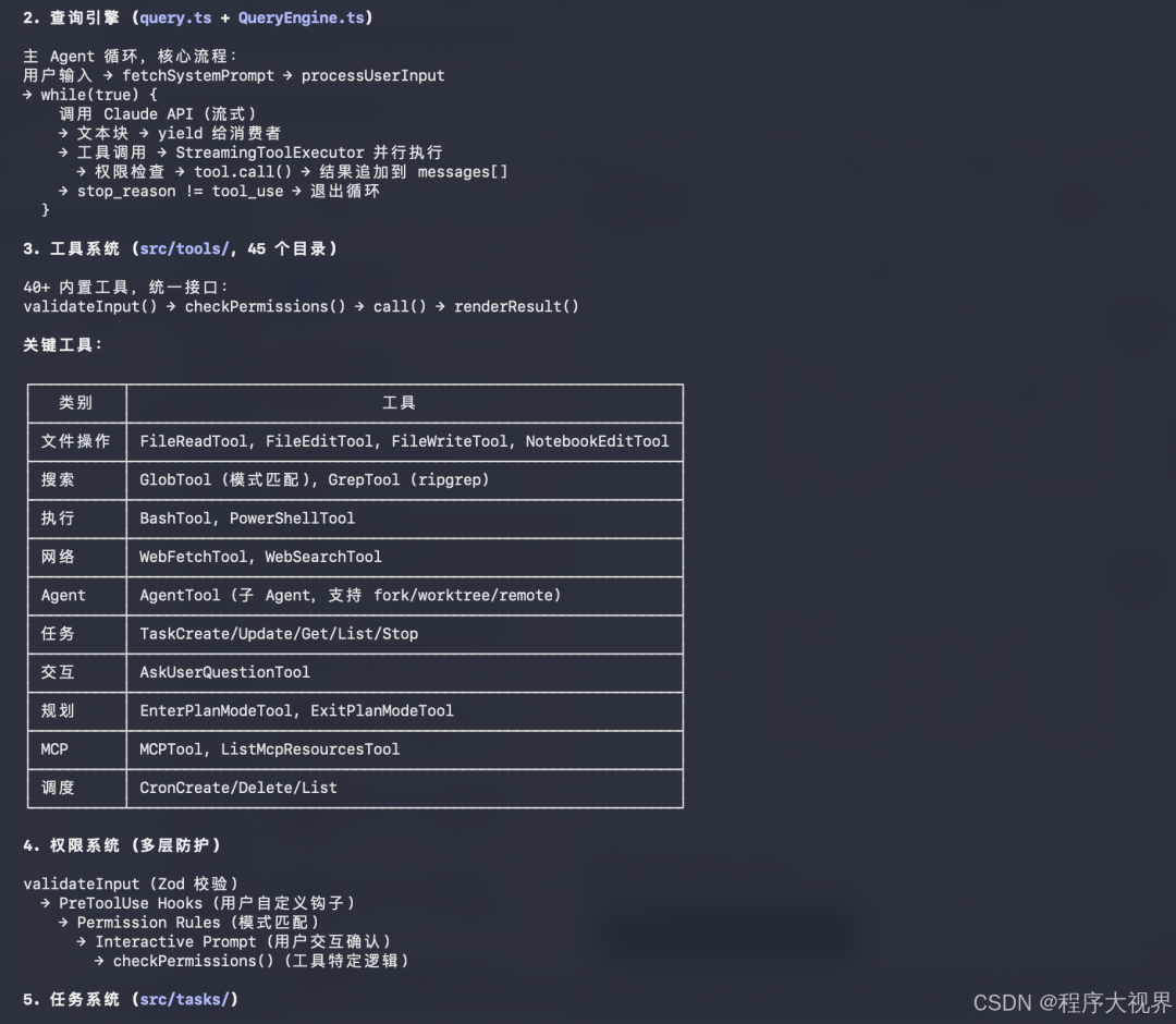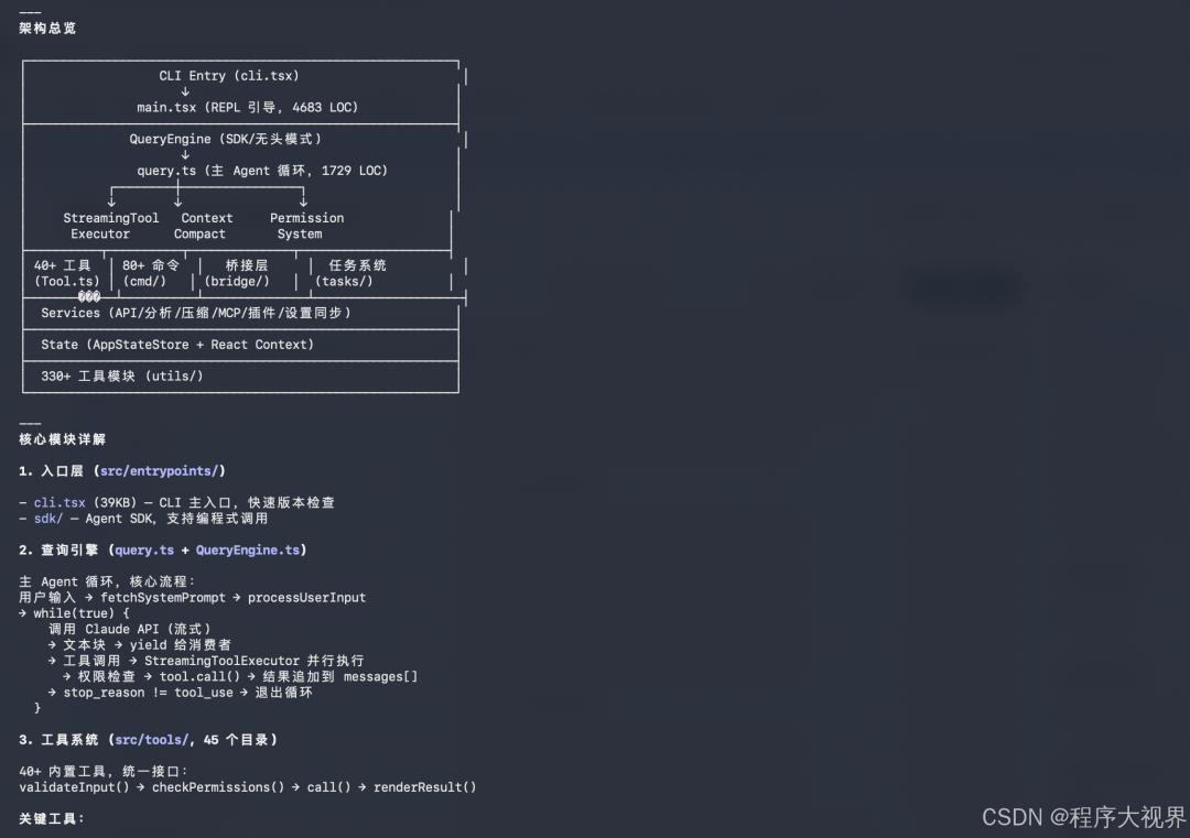 核心架构:CLI 逻辑、工具编排(tool orchestration)、提示词补丁(prompt patch)、权限控制与错误恢复机制。