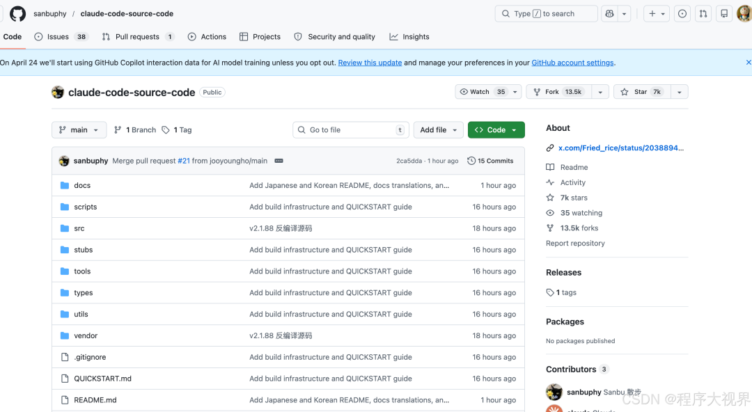 Claude Code源码已经公开,短短几十小时内Fork的几个GitHub账号访问量达几百万,其中有2个具有代表性的账号,一个是Claude Code用TypeScript语言编写的原始代码,一个是用python语言移植版本。