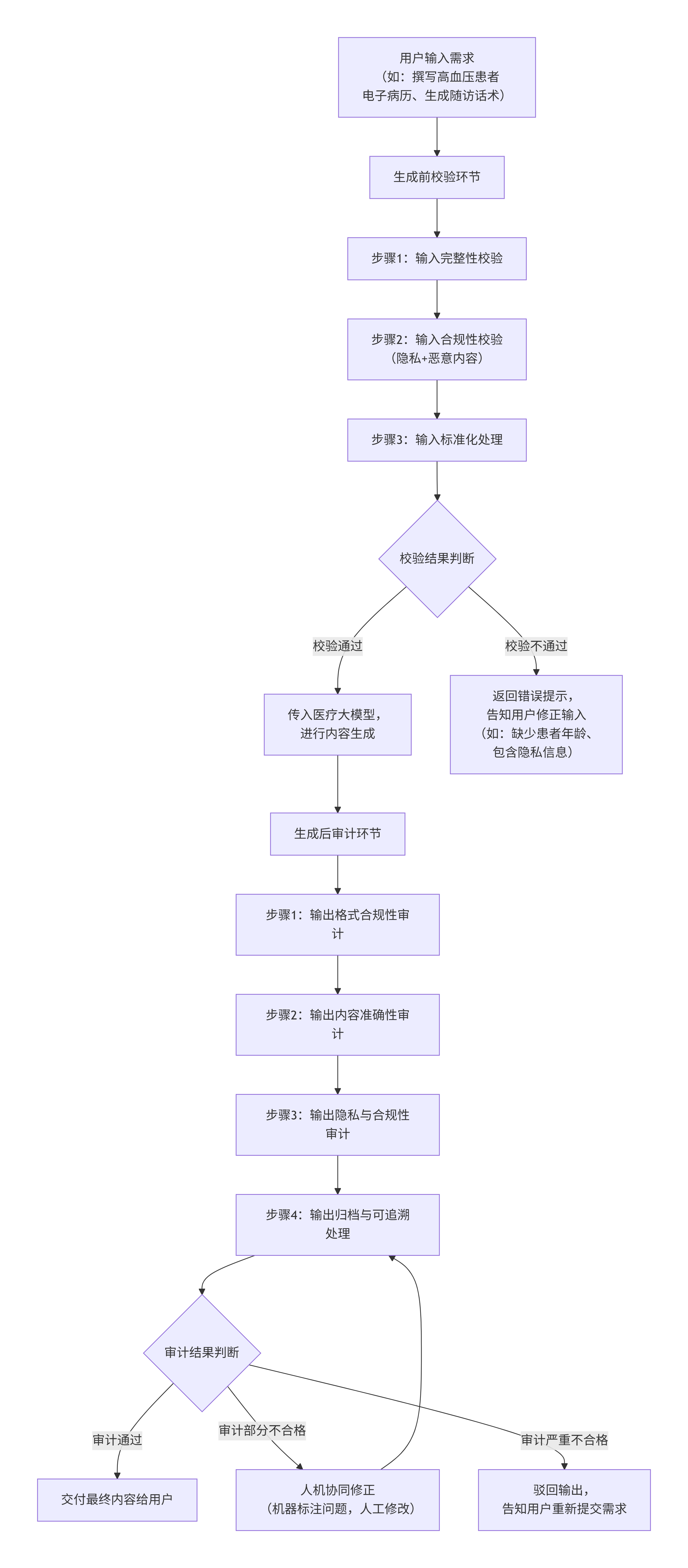 我们提供 “生成前校验” 和 “生成后审计” 的基础说明示例,核心实现完整性校验、隐私信息脱敏、格式合规性审计、简单内容准确性校验,校验基于规则引擎和简易医疗知识库;