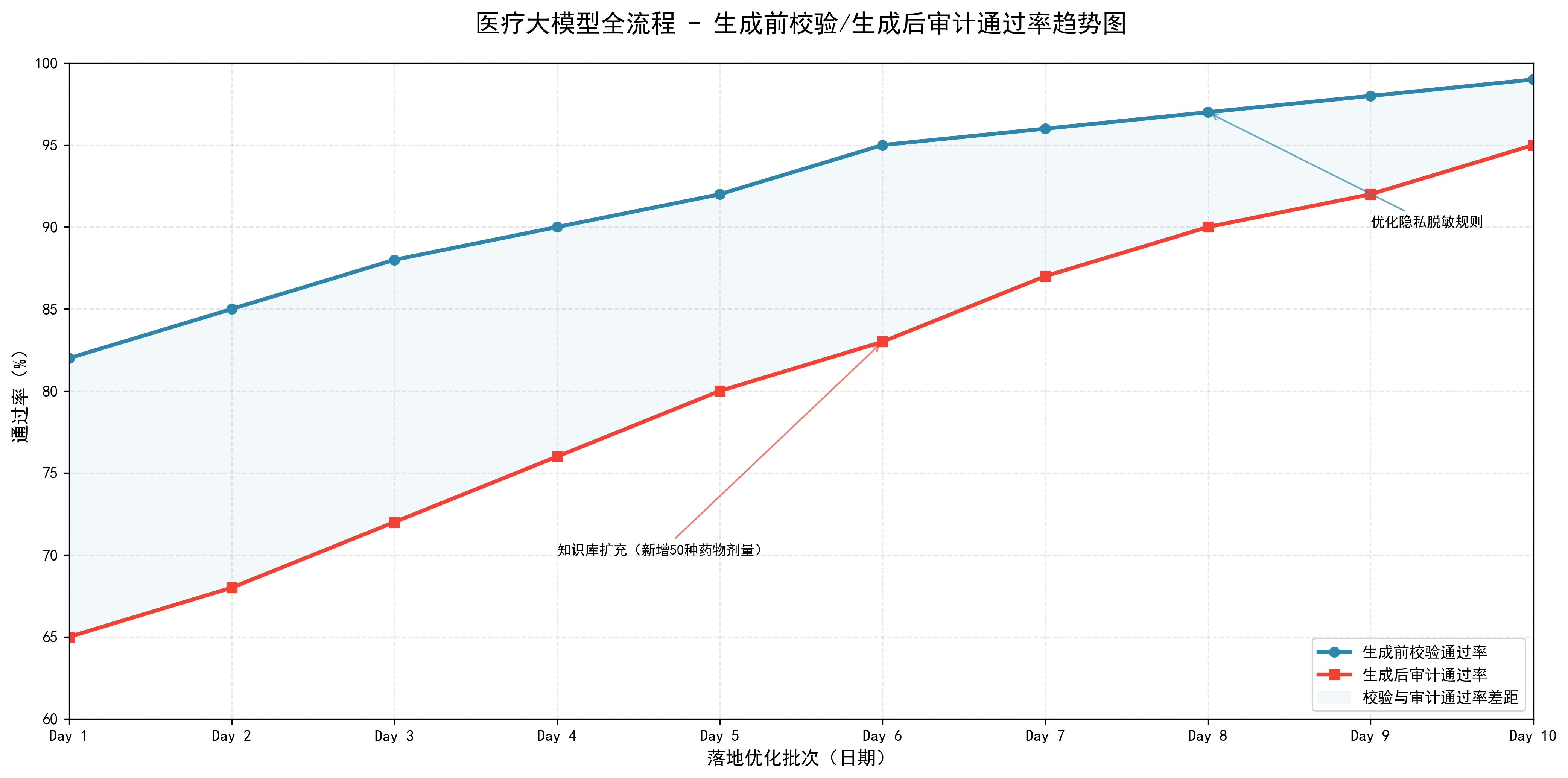 图例说明:直观呈现“生成前校验通过率”始终高于“生成后审计通过率”,符合实际应用中前校验是基础过滤,后审计是深度质检。