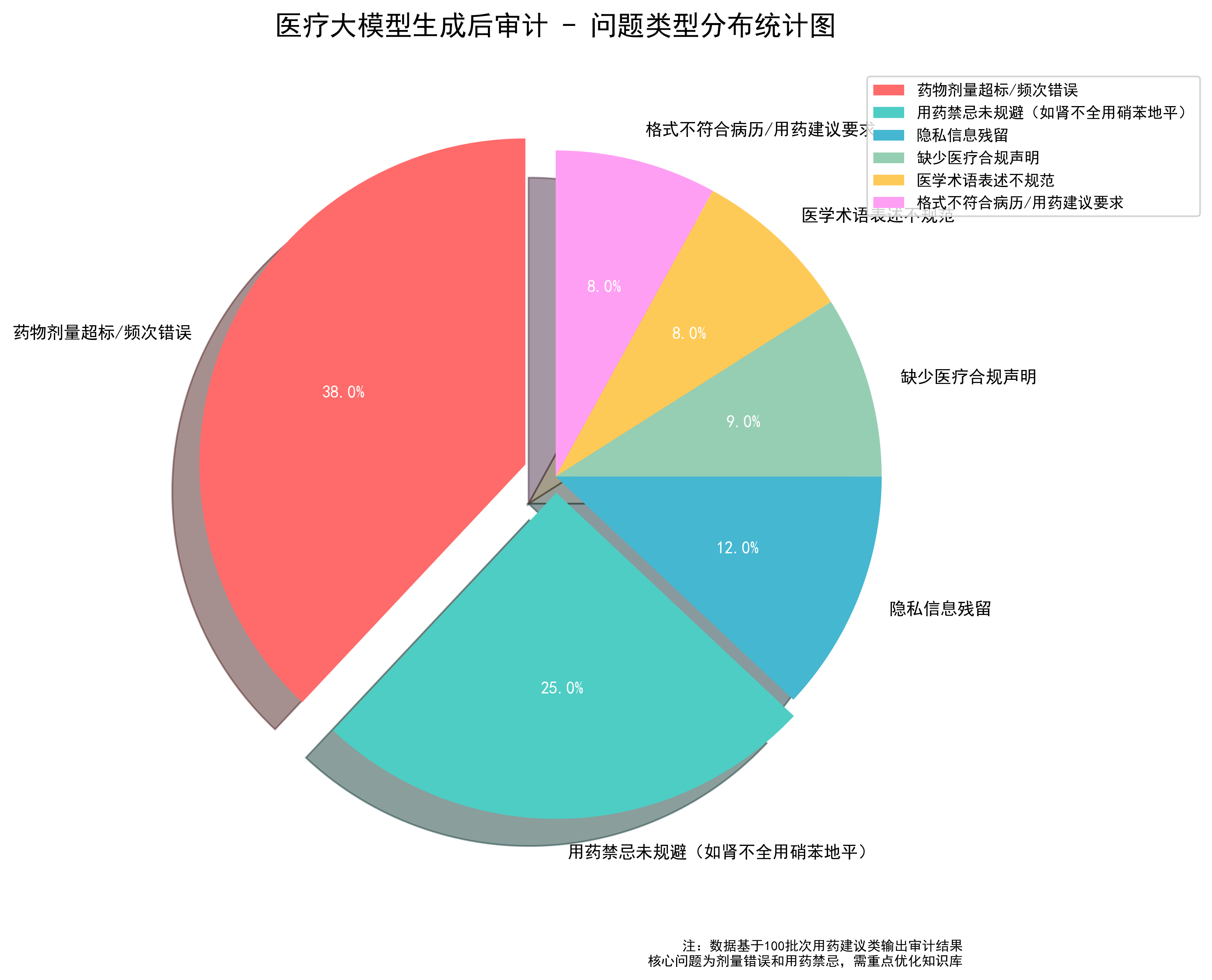 这个图用来展示生成后审计中发现的各类问题占比,比如剂量错误、禁忌风险、格式不合规等,直观呈现核心问题痛点,方便后续优化管控策略。