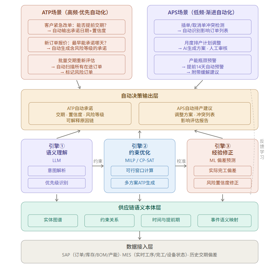 ATP 交期承诺 | 客户需求变更后,自动评估交期可行性,输出承诺日期、置信度、原因链与备选方案 | 高频场景优先实现全自动化 |