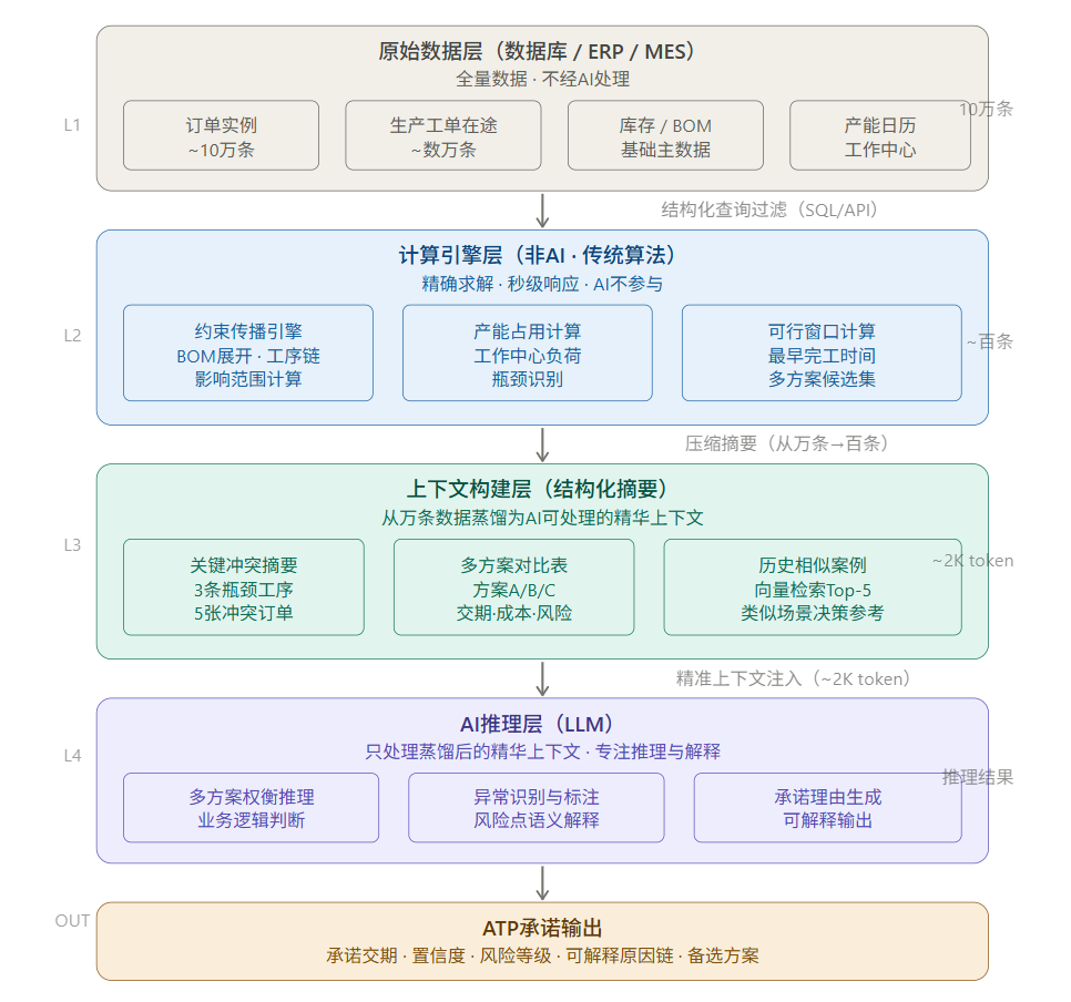 L1 → L2(SQL 过滤,<1秒): 针对当前 ATP 请求,用索引查询从 10 万条中快速定位相关数据——受影响工序链、产能冲突工作中心、交期窗口内在途工单。AI 完全不参与此阶段。