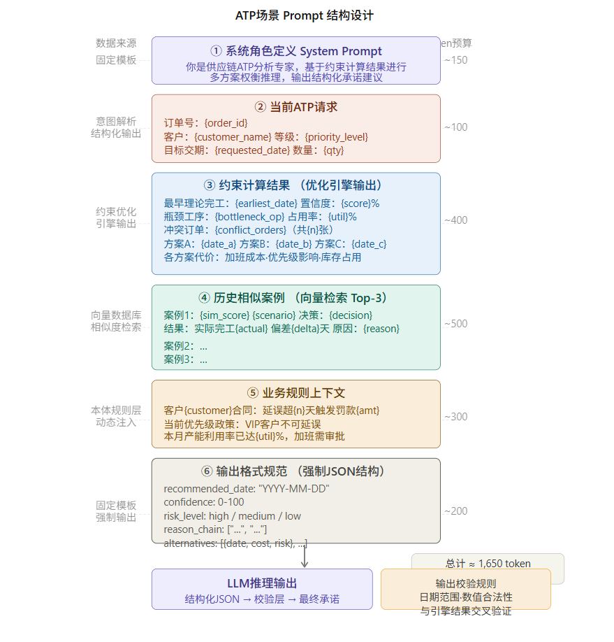 定义 LLM 的专业身份与推理准则:供应链 ATP 分析专家、基于约束计算结果进行多方案权衡、必须输出结构化 JSON。此区块固定不变,确保每次推理的角色一致性。