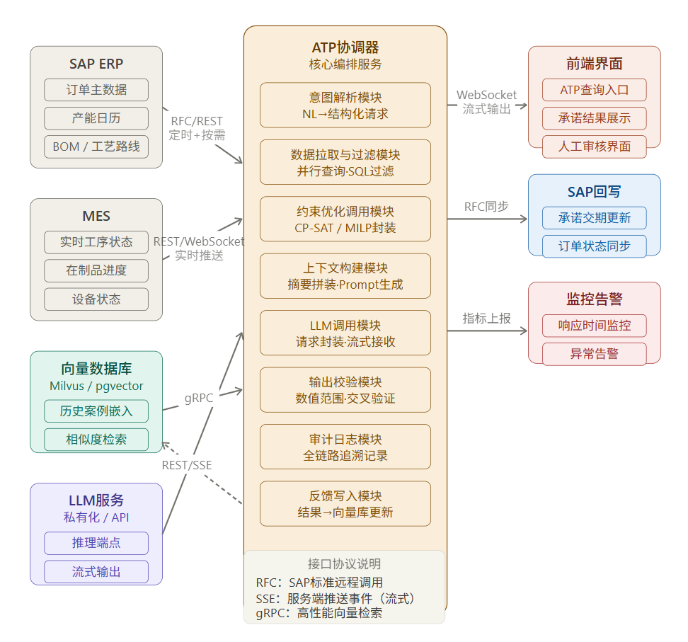 输入: 自然语言 ATP 请求 + 结构化摘要上下文 输出: 结构化 JSON 承诺建议(日期、置信度、风险等级、原因链、备选方案)