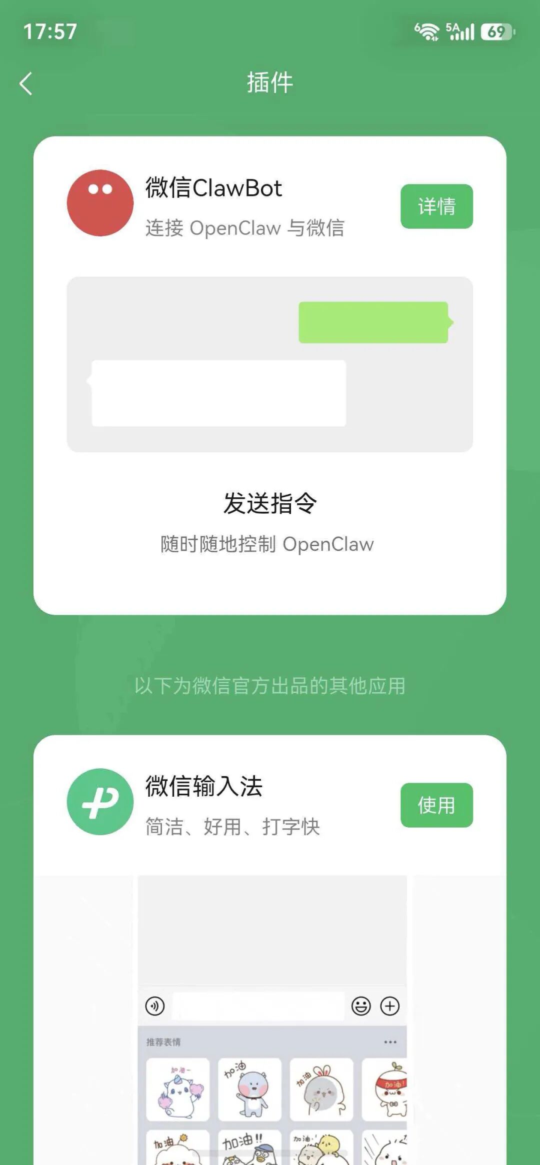 打开微信,然后在“我-设置-插件”路径查看终端安装指令,直接通过扫码或者复制命令就可以链接。连接成功后,这次主要有以下功能: