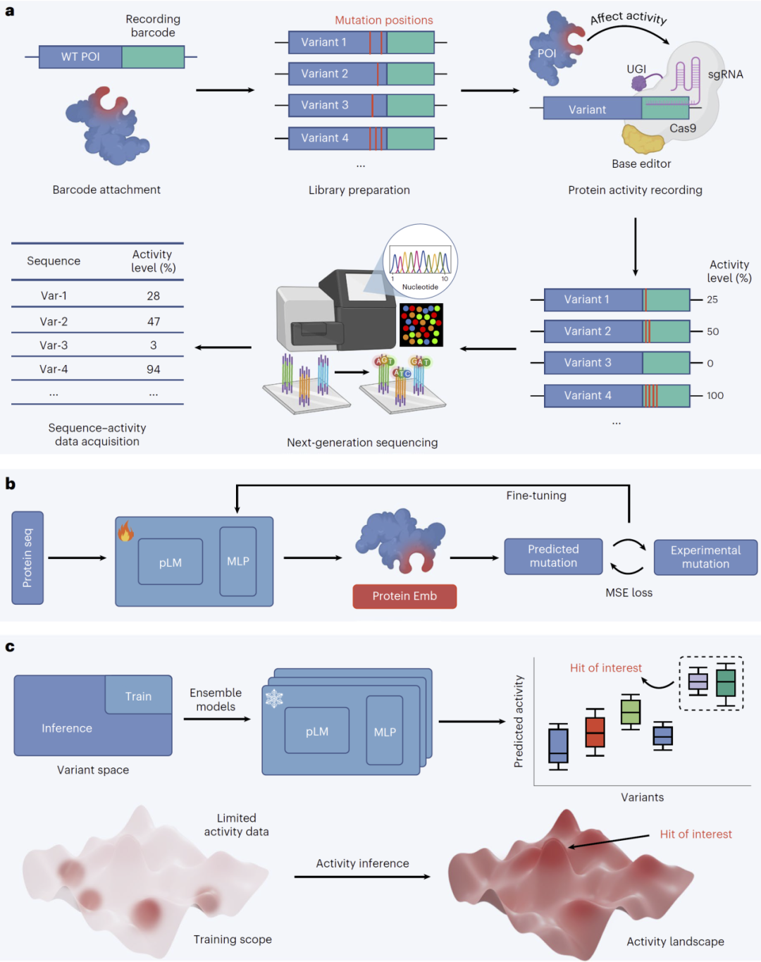 在此基础上,研究人员进一步引入蛋白语言模型,对这些数据进行建模,从而构建蛋白活性景观,并预测未测变体的功能表现。
