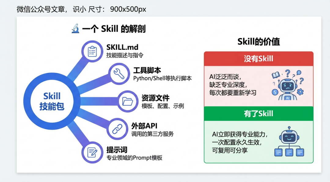 Skills = 预封装的专业能力包,让 AI 秒变领域专家。类比:你雇了一个聪明的实习生(LLM),但他什么都不懂。Skills 就是给他提前准备好的「工作手册 + 工具包」。