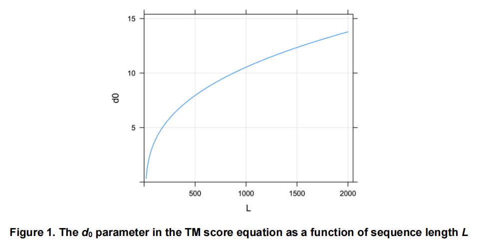 的作用是消除 TM 评分对序列长度的依赖性——对于长蛋白,允许更大的平均偏差仍能得到合理的 TM 分值。当 时, Å;当 时, Å。