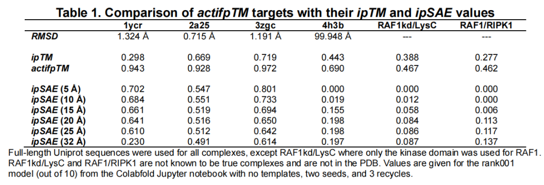 以上三个体系中,actifpTM 给出接近 1.0 的高分,ipSAE 的绝对值较低(0.55–0.73),但两者都正确识别了真实互作。