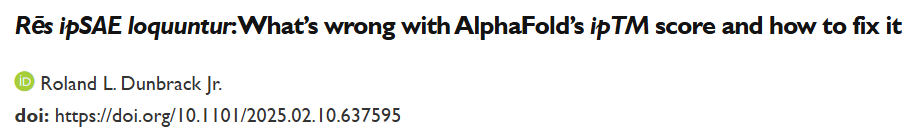 原文:Dunbrack RL Jr. Rēs ipSAE loquuntur: What's wrong with AlphaFold's ipTM score and how to fix it. bioRxiv 2025.02.10.637595; Version 2, December 15, 2025. DOI:https://doi.org/10.1101/2025.02.10.637595 代码:https://github.com/dunbracklab/IPSAE
