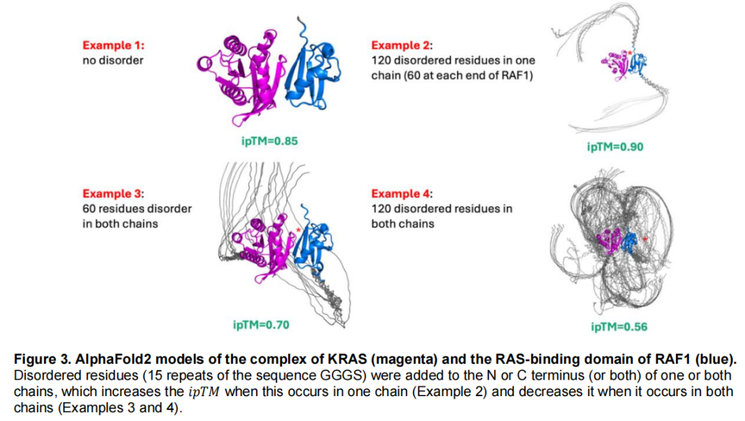 当仅有一条链被添加了大量无序区域或辅助结构域时,ipTM 可能虚假升高。这给基于 ipTM 筛选相互作用的高通量流程带来假阳性风险。