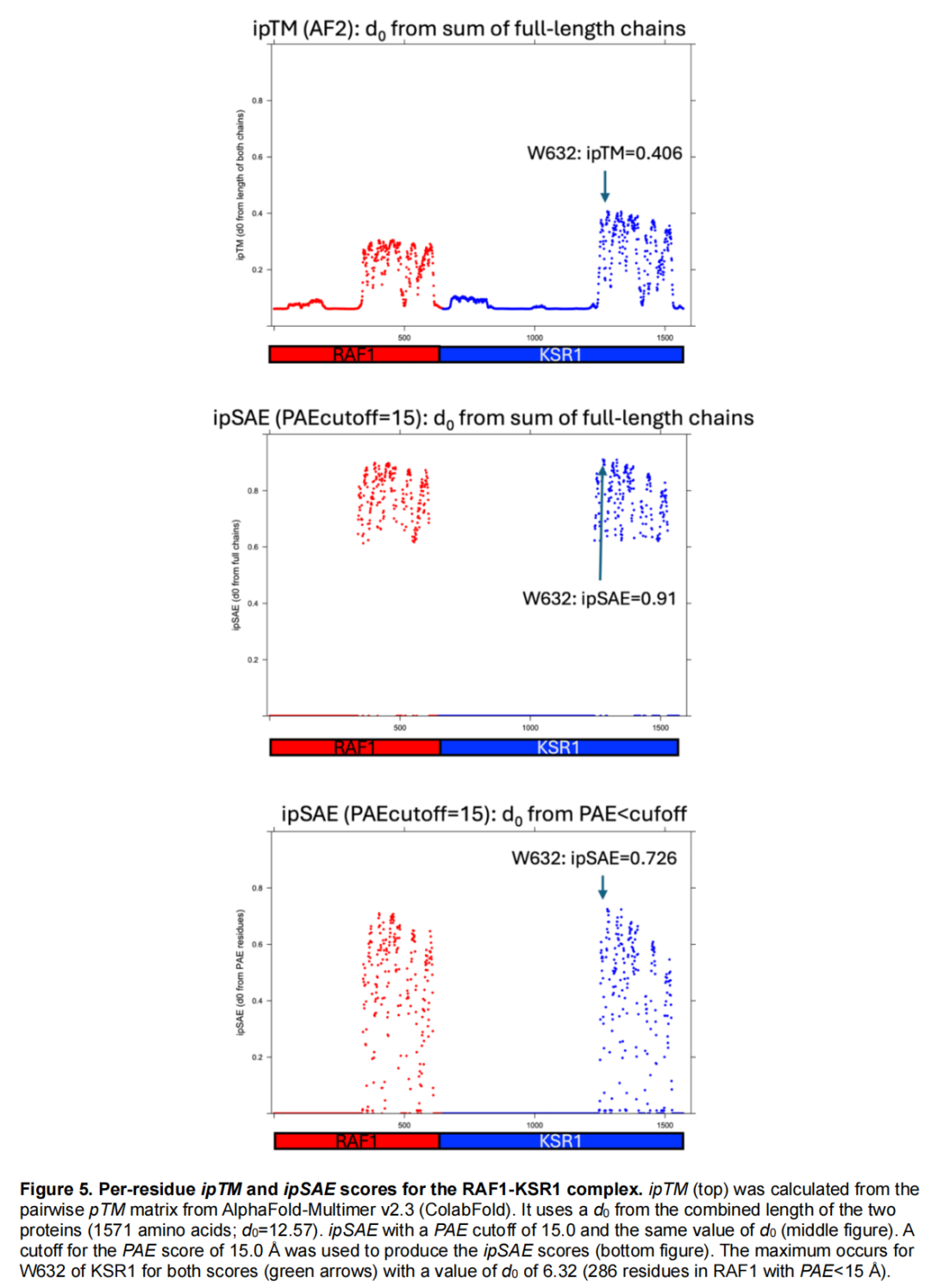 多链复合物:ipSAE 为复合物中所有链对计算独立的非对称和对称 ipSAE 值,可区分如三体复合物 RAF1-KSR1-MEK1 中各对链的互作质量(例如 RAF1-MEK1 的 ipSAE = 0.261,表明在该模型中两者未直接接触,而 KSR1-MEK1 的 ipSAE = 0.636,互作良好)。