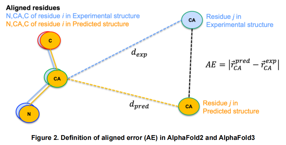AlphaFold 用"预测对齐误差"(PAE)代替实验距离,将 TM 评分框架应用于置信度预测。PAE 代表:在将残基 的局部坐标系对齐后,残基 的预测位置与真实位置之间的期望误差(Å)。