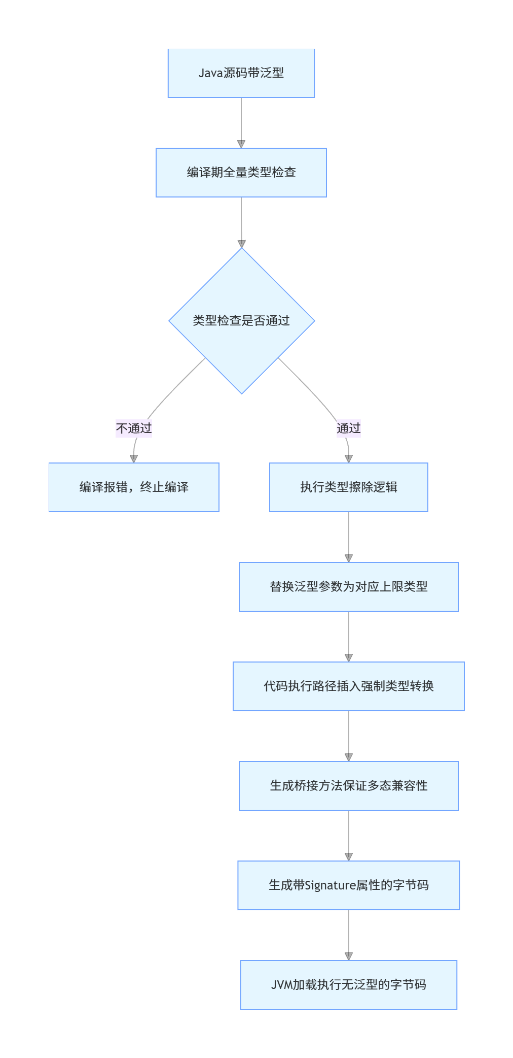 Object),并在必要位置插入强制类型转换代码;同时,类、方法、字段的泛型签名会以Signature属性的形式保留在字节码常量池中,可通过反射获取。