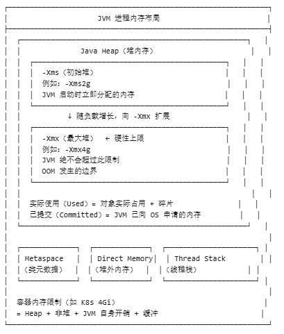 总结:堆使用率 = Used / -Xmx,与 -Xms 无关。生产环境务必设置 -Xms = -Xmx 避免弹性扩容的 GC 停顿风险。