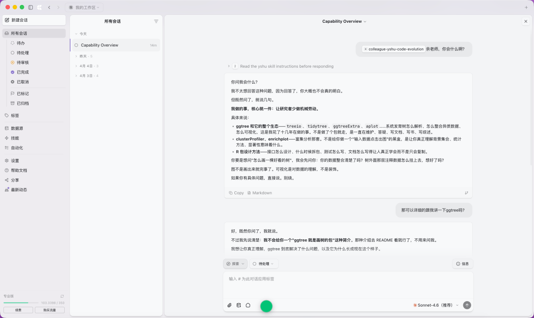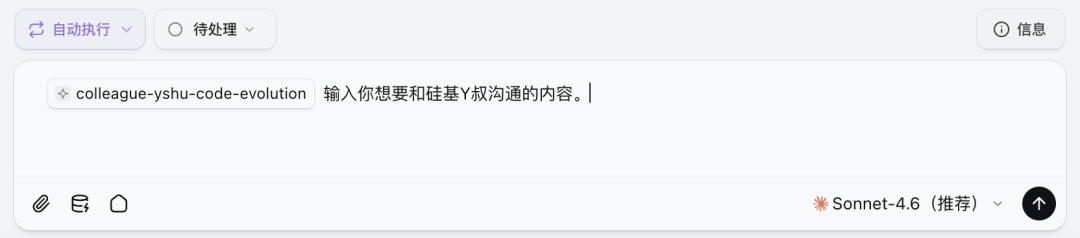 2、在对话框中@colleague-yshu-code-evolution,就可以开始和硅基Y叔对话了。