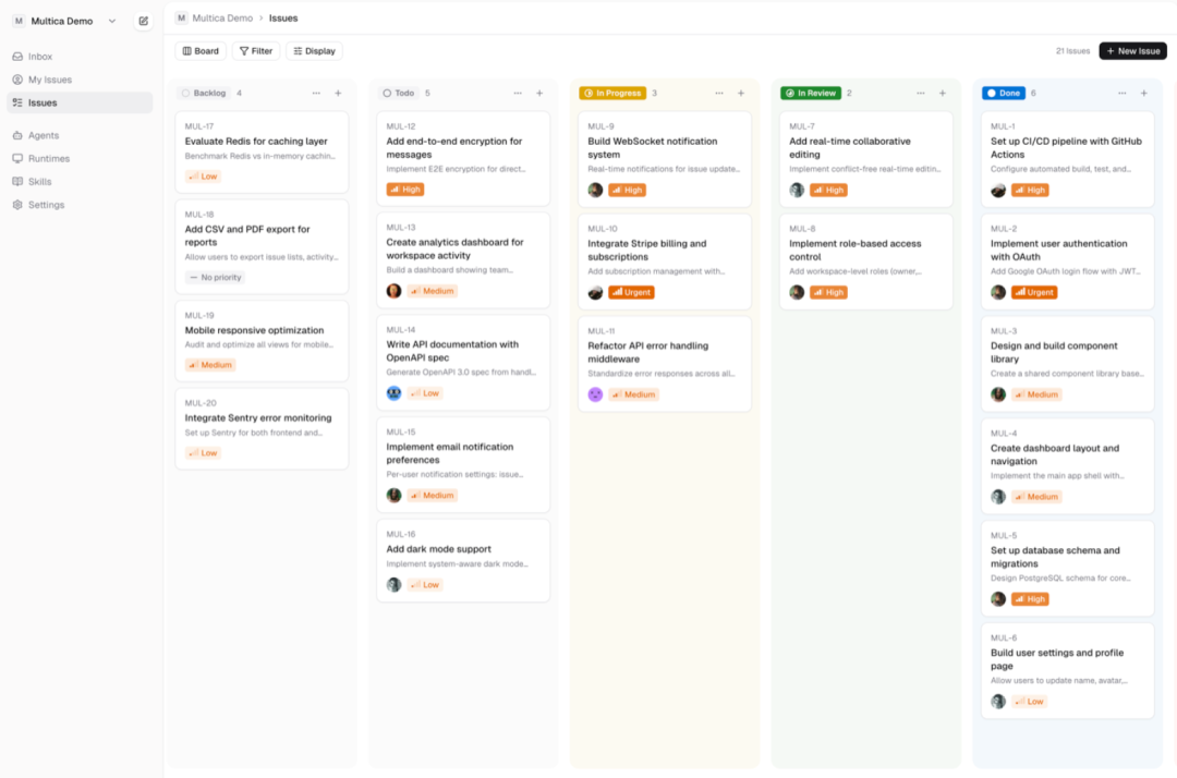 从看板创建一个 Issue(或者通过 multica issue create),然后把它指派给你的新 Agent。Agent 会自动接手任务,在你的 Runtime 上执行,并汇报进度——就像一个人类队友一样。
