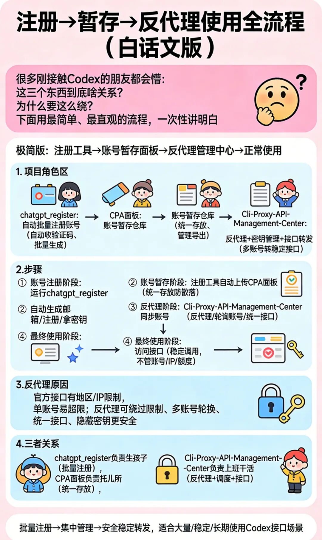 这套流程,本质就是: 批量注册 → 集中管理 → 安全稳定转发 适合需要大量、稳定、长期使用 Codex 接口的场景。 按这个流程走,基本不会踩坑,也能理解每一步在干嘛。