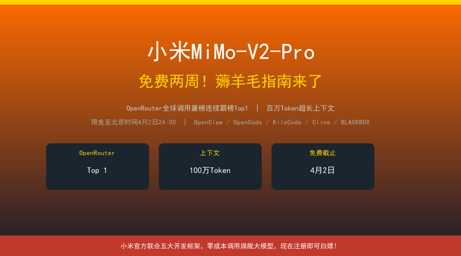 科技圈的羊毛党们狂喜!凭借匿名霸榜OpenRouter的实力圈粉无数的小米MiMo大模型,免费Token活动居然延长了!原本仅一周的限免福利,因太火爆直接加时一周,免费使用截止到2026年4月2日24:00。