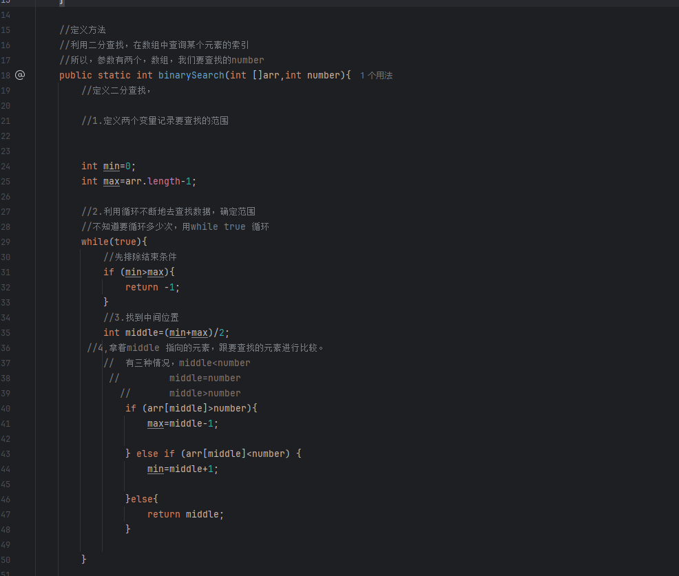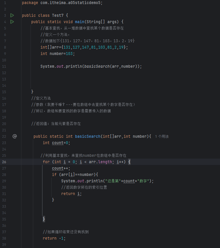 (算是一个很基础的算法,但还是有很多细节的,方法的返回值类型,带参方法的参数选取(明确方法要做什么,完成什么需求,用到什么参数,进行传递,正如所示代码,在数组中查找数据,肯定需要数组,和所需查找的元素,因此方法中传入这两个参数,在调用方法是进行赋值))