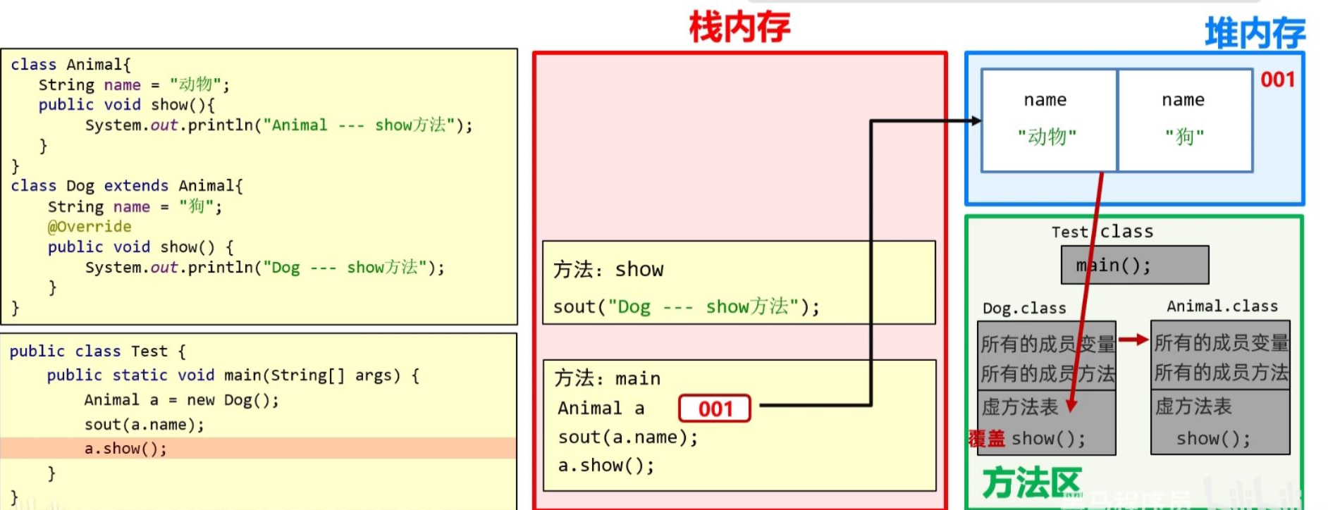 成员方法:如果子类对方法·进行了重写,那么在虚方法表中是会把父类的对象进行覆盖的。