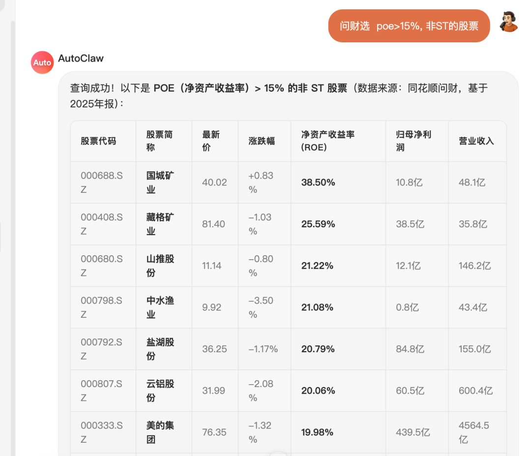 打开交易软件,面对 5000 多只 A 股,你想找一个"ROE 大于 15%、市盈率低于 20、营收增速超 30%"的公司。结果呢?你得在行情软件里设置十几个筛选条件,导出 Excel,再手动清洗数据,折腾半天才能拿到一个粗略的名单。