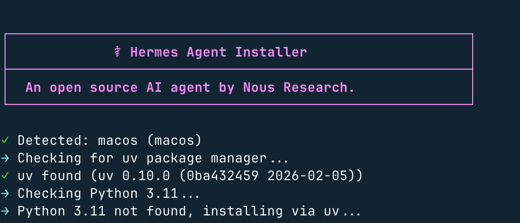 curl -fsSL https://raw.githubusercontent.com/NousResearch/hermes-agent/main/scripts/install.sh | bash