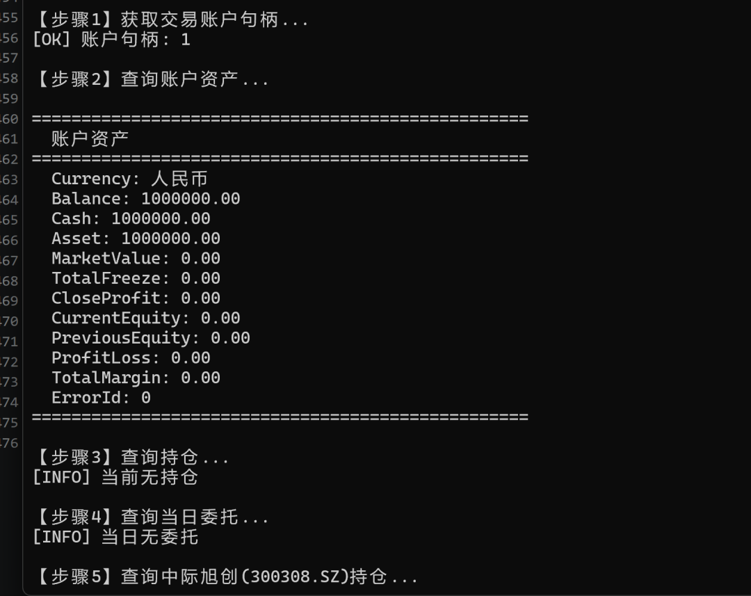 这里我简单封装了个例子,包括初始化链接、查询资产、持仓、委托、 买卖下单的例子。 有需求的可以参考, 买卖由于晚上没法测试,就看下演示效果。