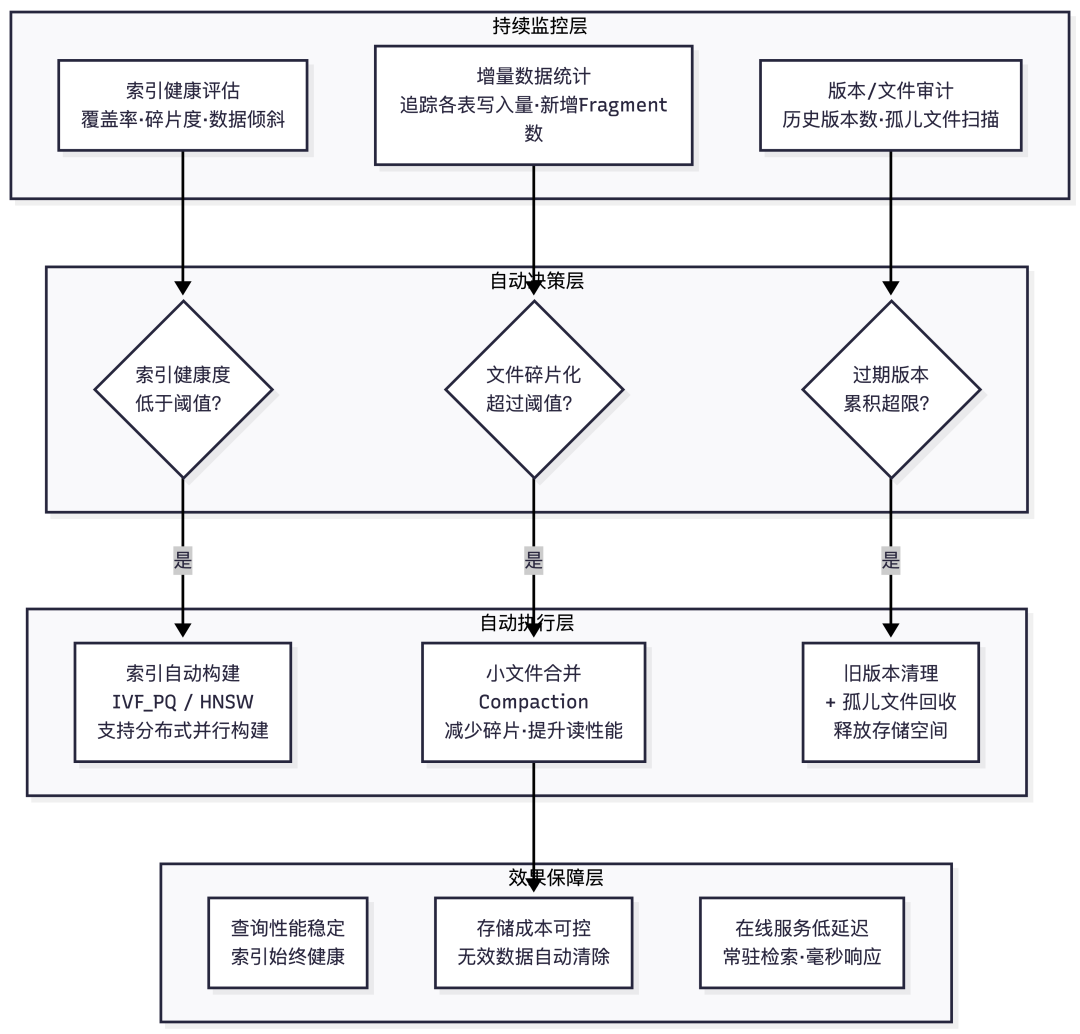 四是治理能力难以长期依赖人工运维。 索引重建、版本清理、小文件合并、查询优化等都是规模化运行中的常态任务,缺乏自动治理将导致性能与一致性随规模增长逐步恶化。
