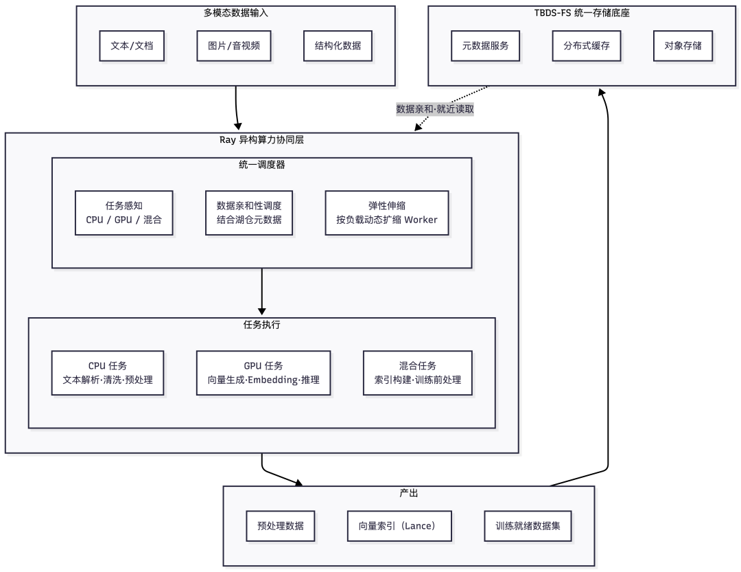 从工程实施角度看,TBDS多模数据湖引擎通过异构算力协同能力(底层基于 Ray 并结合数据湖元数据做了数据亲和性调度增强),显著缩短了预处理、索引构建与训练链路之间的数据流转距离,减少跨系统搬运带来的额外复杂度。对于大规模知识库与多模态训练前处理场景而言,这种协同能力具有较高现实价值。