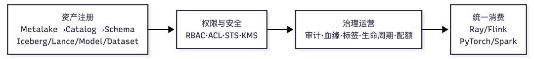 第三阶段:治理运营。 覆盖审计日志(全操作可追溯)、数据血缘(跨格式全链路追踪,从 ETL 到向量索引到推理服务)、标签分类(业务标签与数据等级)、生命周期管理(TTL 过期与自动归档)及配额管控五大能力,确保数据资产可持续运营而非一次性消耗。