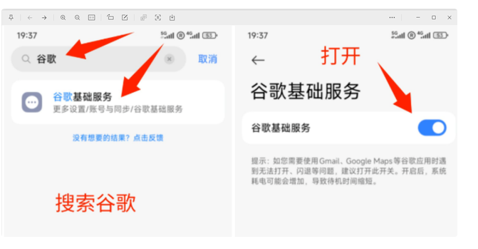 这种是最简单的。比如小米和红米的机型,直接打开设置,搜索谷歌,然后启用谷歌基础服务。
