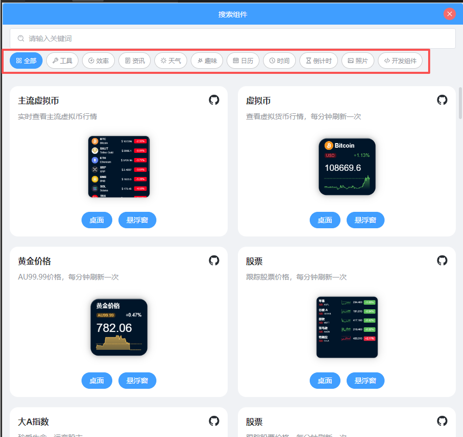 1.打开后主界面组件都在里面,包含了:工具、效率、资讯、天气日历、趣味、时间、倒计时、照片、开发组件10大分类。