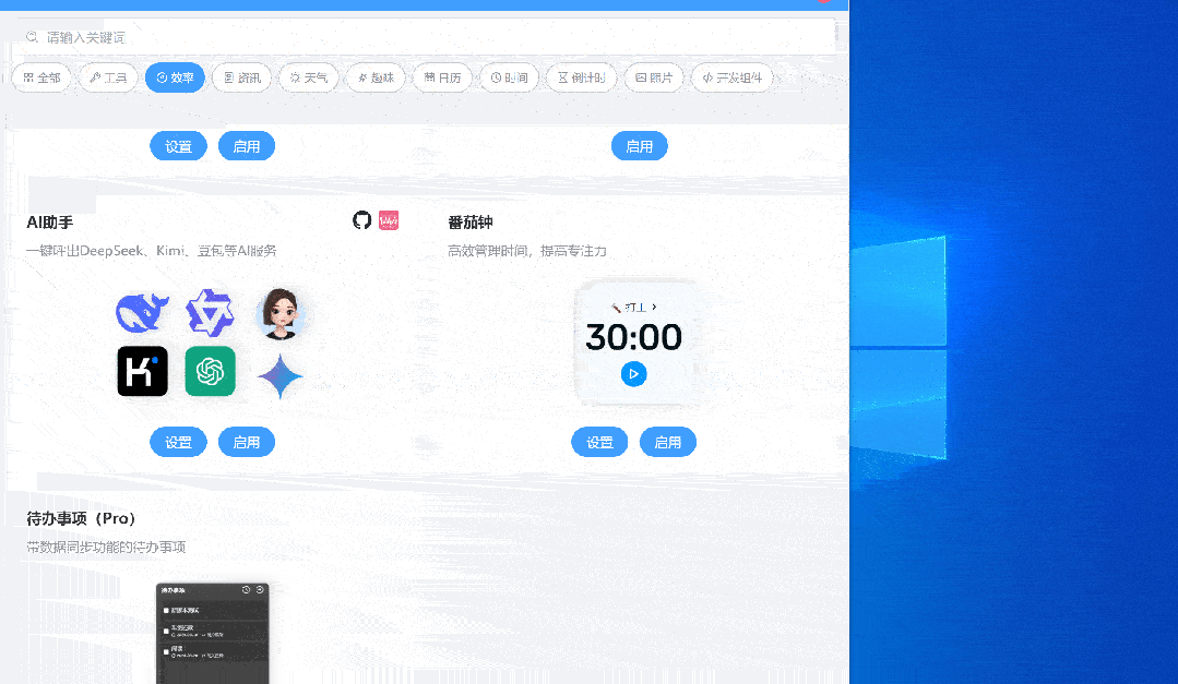 5.比如你想添加AI组件,直接点击“启用”即可,这个AI助手内置了Kimi、deepseek 、问小白等主流免费的AI,可以随意切换使用各种AI模型,非常方便。