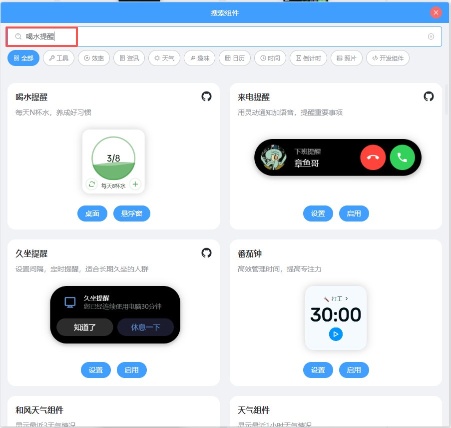 2.我们找到需要的组件,比如“喝水提醒”,点击桌面,组件就会在桌面上,悬浮也差不多的可以试试区别。(这里也可以搜索框直接搜索需要的组件)