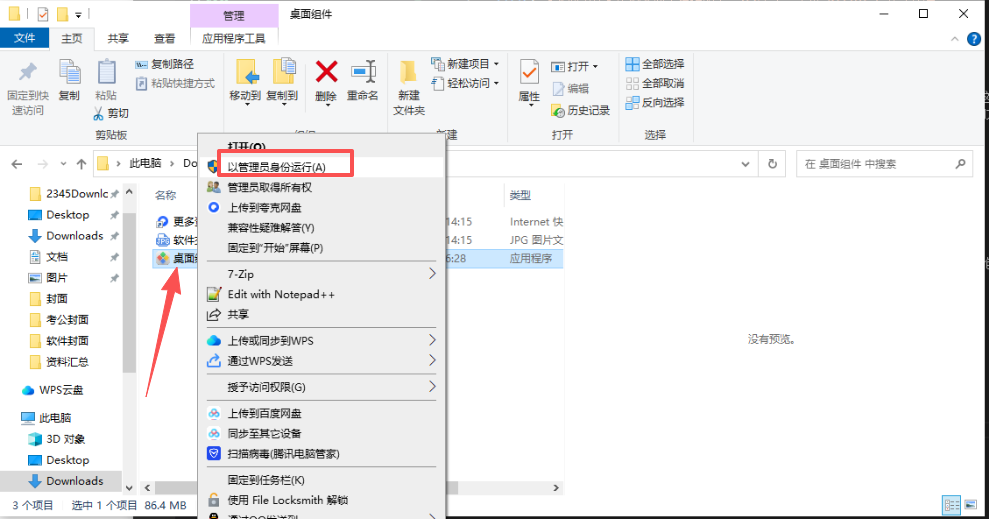 3.找到‘桌面组件’,右键‘以管理员身份运行’,如图