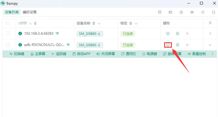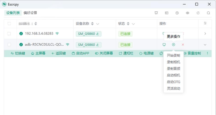 3.这时 Escrcpy 设备列表应该已经检测到你的手机,点击开始镜像。