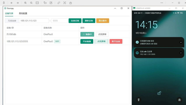2.将获取到的设备 IP 地址及端口号填写到 Escrcpy 中,然后点击连接设备