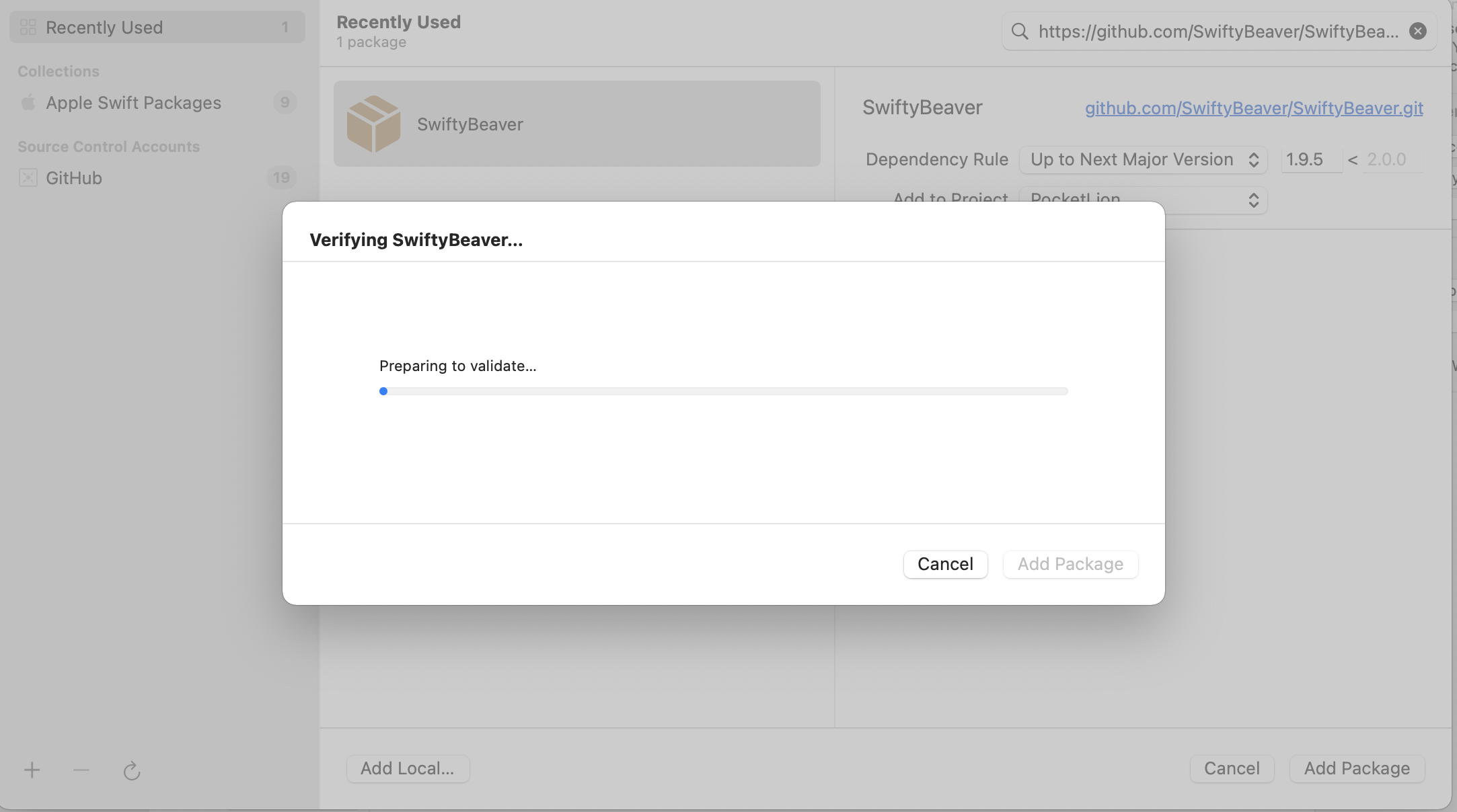 我使用Xcode 13.4.1,在尝试将我的项目从CocoaPods转换为SPM包时遇到了同样的问题,因为我使用的是Legacy Build Location设置。当试图安装任何软件包时,它会立即挂起“准备验证.”。就像问题的截图一样。