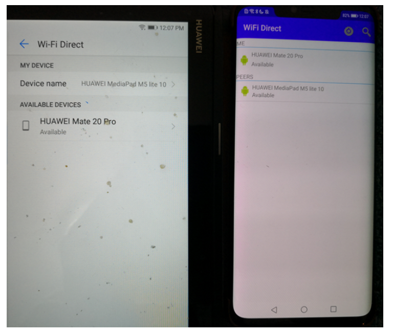 因为我没有WiFi直接的打印机,所以我在一些华为设备上验证了WiFi Direct,这些设备包括Mate 20 Pro、Mate 30、MediaPad M5 Lite 10、MatePad Pro以及LG和三星的设备,包括V30和GalaxyS5。我使用设备上的apk通过WiFi直接连接其他设备。这种装置的工作原理很好。下面是Mate 20 Pro和MediaPad M5 Lite 10之间测试的屏幕截图。