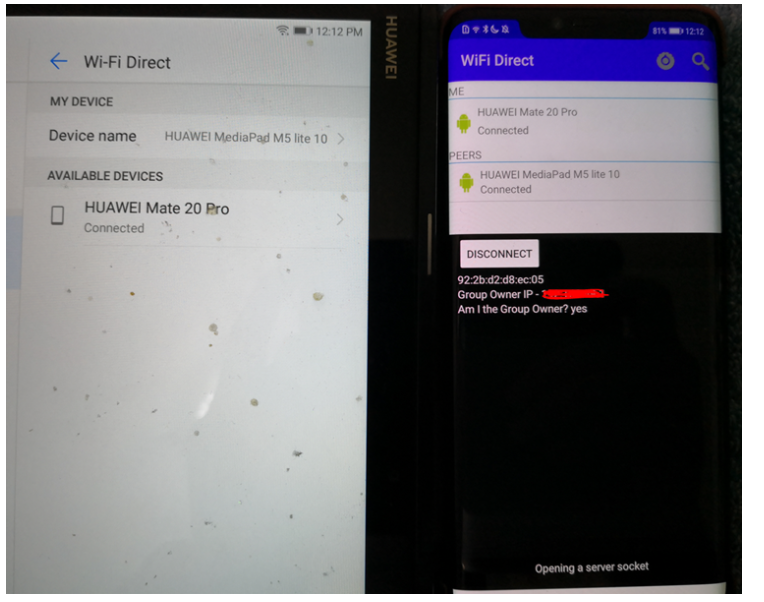 以下是WiFi Direct连接Mate 20 Pro和MediaPad m5 Lite 10. https://drive.google.com/file/d/1SKUAAgw0dif7ifshVBq8ficRv8YJN7dq/view?usp=sharing的短片