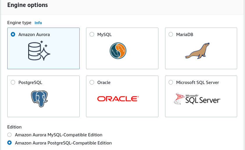 集群是Aurora的,而不是RDS的。因此,当您尝试在AWS控制台中创建数据库时,您必须确保选择 Aurora:
