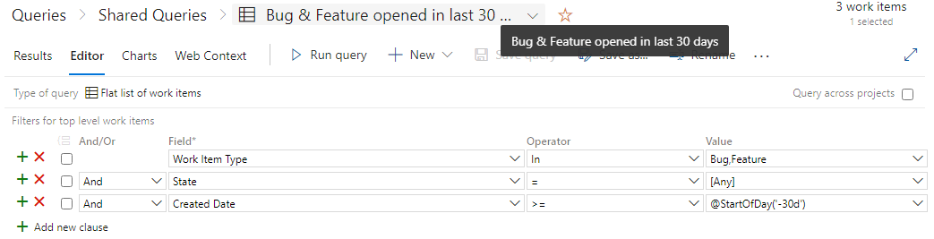根据您最近的回复,您想要得到在过去30天内处于开放状态的Bug和功能。对于这些工作项,我们可以认为它们满足以下条件之一: