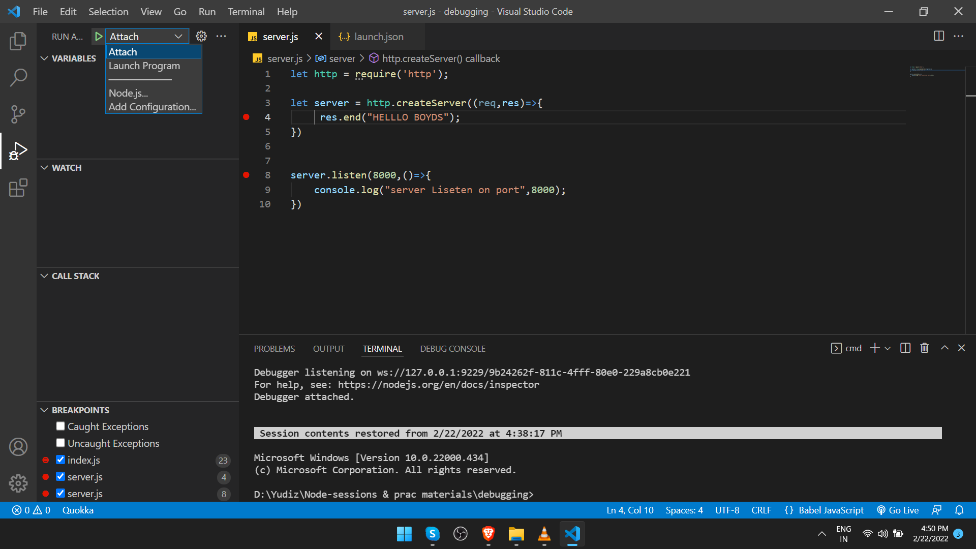 当我们调试节点js应用程序时,附加和启动之间有什么区别??