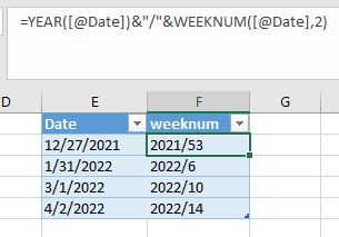 weeknum列下面的公式可以创建一个srting: 2022/10. =YEAR([@[Date]})&"/"&WEEKNUM([@[Date]],2)